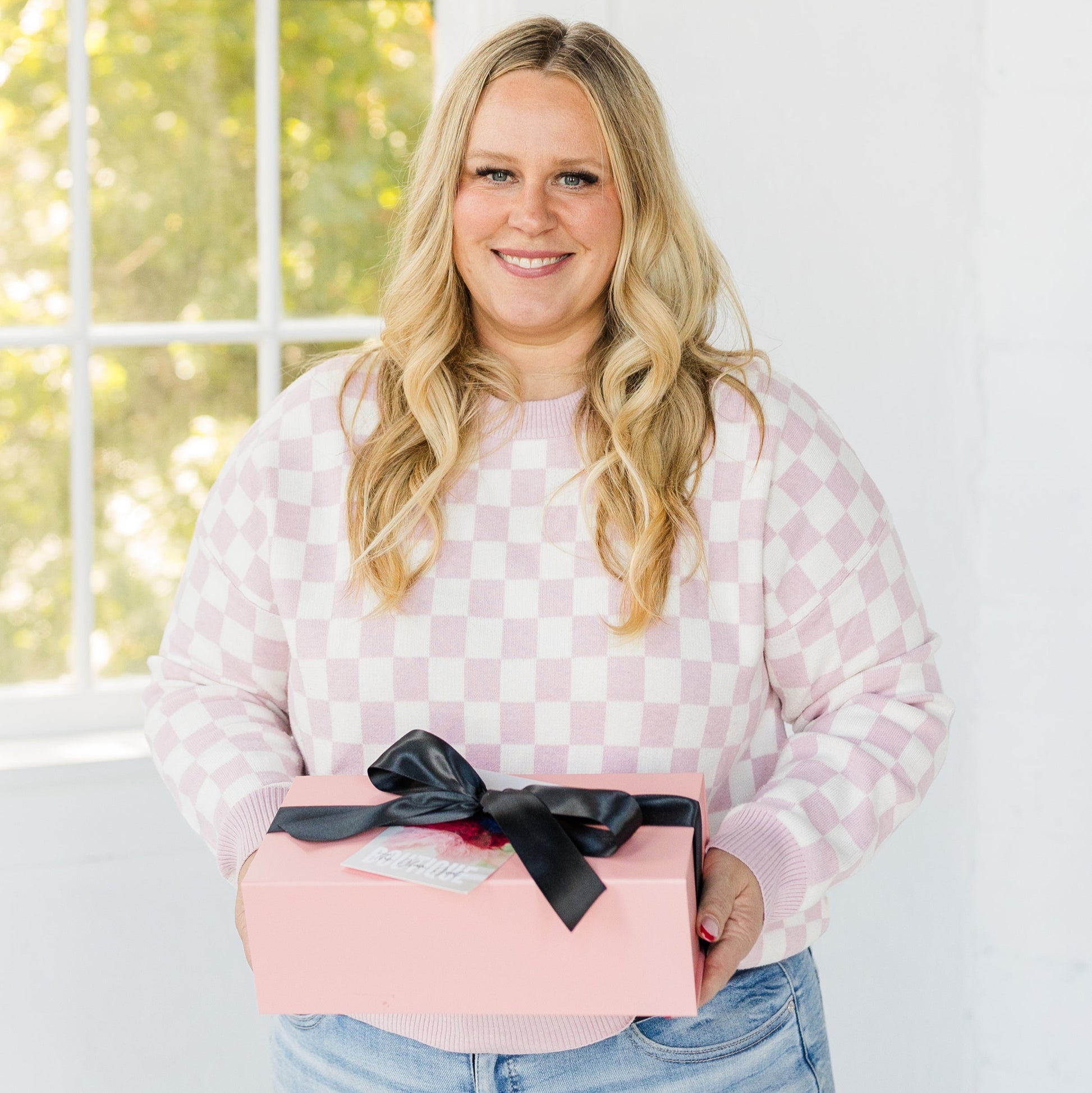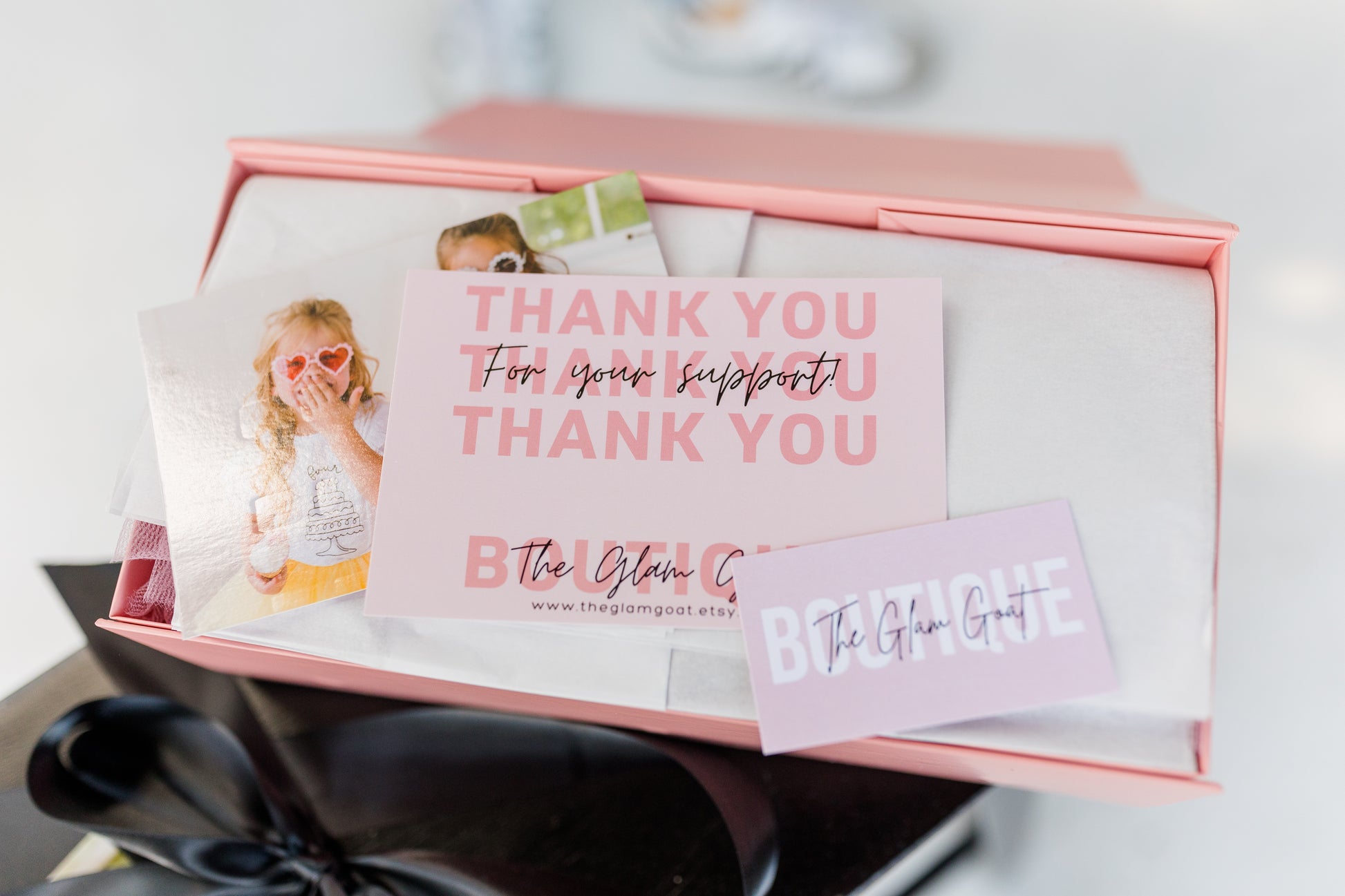 Pink Box with magnetic sealing closer, tissue paper, black satin bow, business card, and personalized note from buyer to receiver